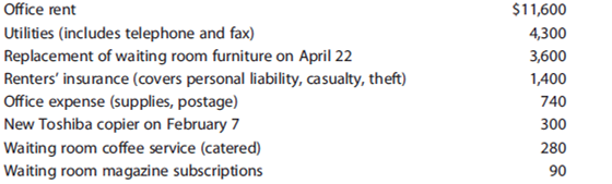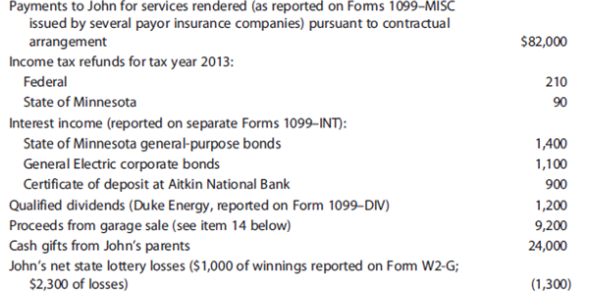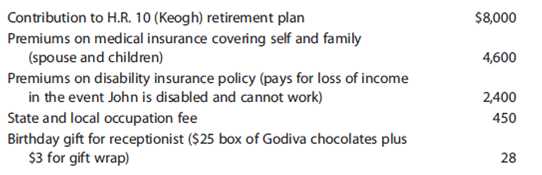 1. John represents several national casualty insurance companies on a contract basis. He operates this business on the greenbacks basis. He is paid a retainer and receives boosted compensation if the claims he processes for the twelvemonth exceed a specified number. As an contained contractor, he is responsible for whatever expenses he incurs. John works out of an office about his home. The function is located at 1202 Motel Road. He shares Suite 326 with a fiscal consultant, and operating expenses are divided every bit between them. The suite has a common waiting room with a receptionist furnished and paid by the landlord. John paid his one-half share of the 2014 expenses as detailed below: