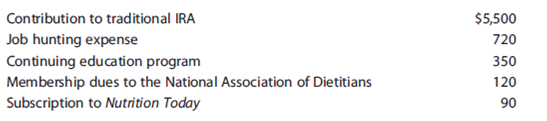 4. Anne earns $32,000 working equally a registered dietitian for the Aitkin Public Schoolhouse District. The chore she holds, director of the schoolhouse lunch plan, is not classified every bit full fourth dimension. Consequently, she is not eligible to participate in the teacher retirement or health insurance programs. Anne's expenses for 2014 are summarized as follows: